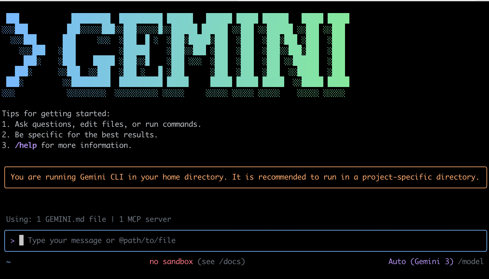 Dengan instalasi global, Anda dapat menjalankan perintah gemini dari direktori mana pun di sistem Anda.